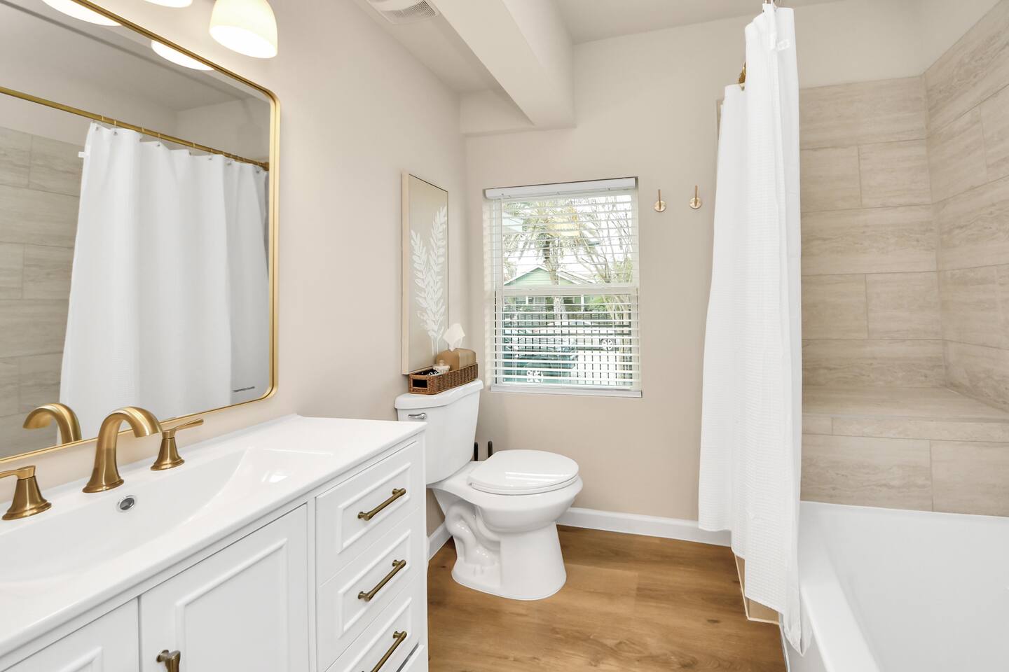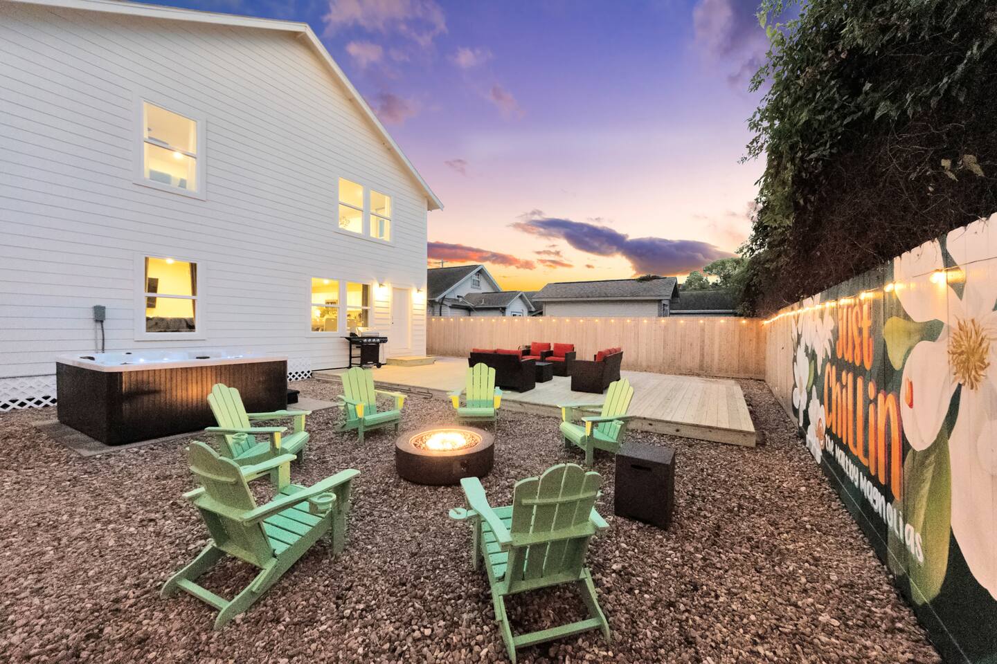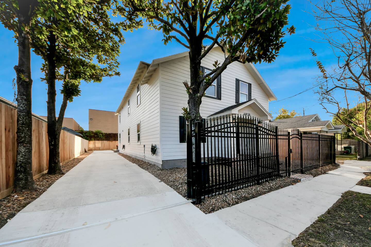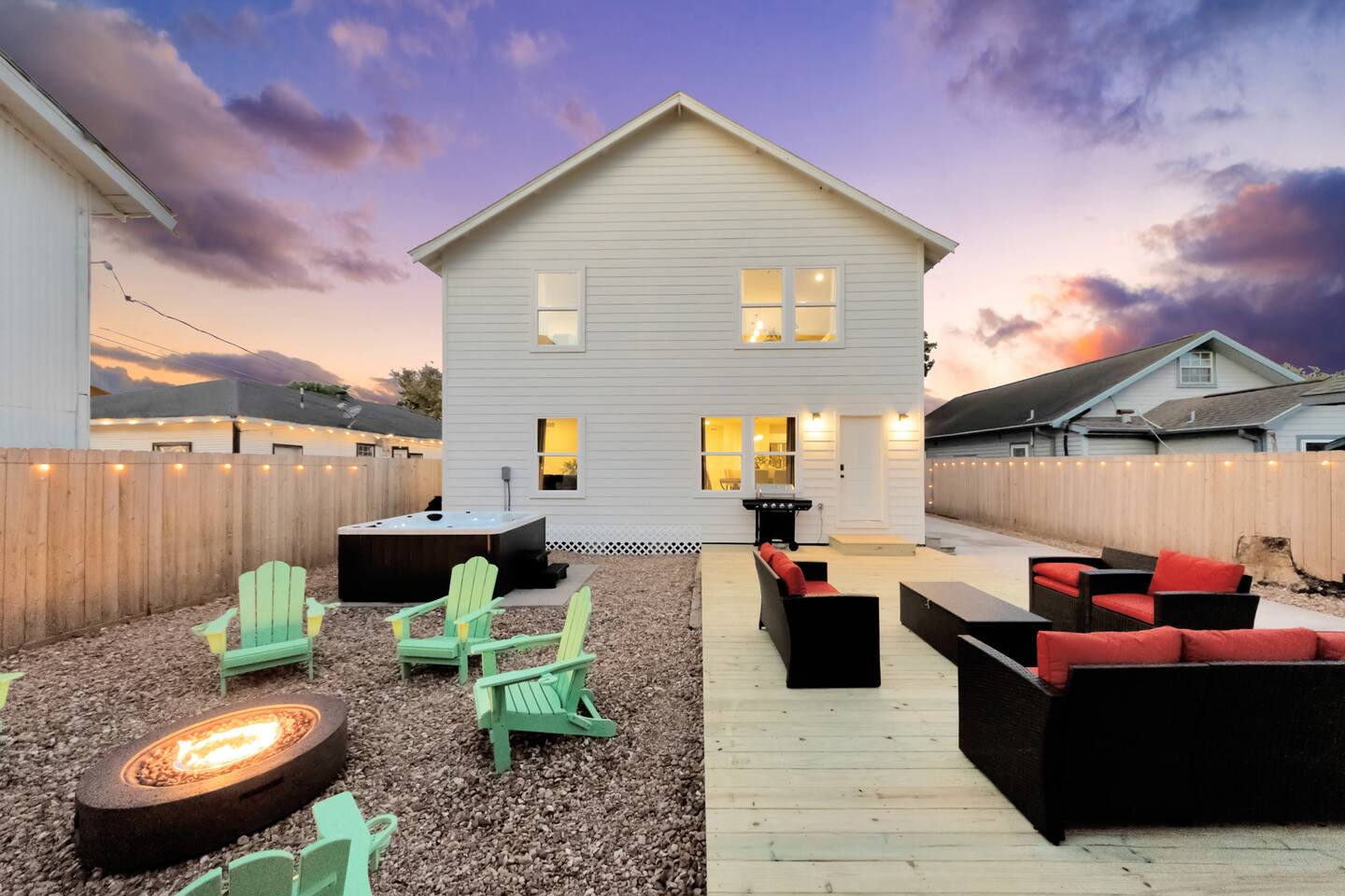 Welcome to The Maltby Magnolias. This freshly renovated duplex sits in Houston’s Greater East End and comfortably hosts up to 16 guests. Each level has its own fully equipped kitchen, open living area, private bedrooms, and three updated bathrooms. Outside, you’ll find a custom hangout space with a patio, hot tub, and plenty of room to unwind with family and friends. The property also includes a tall privacy fence and gated parking for up to three vehicles.